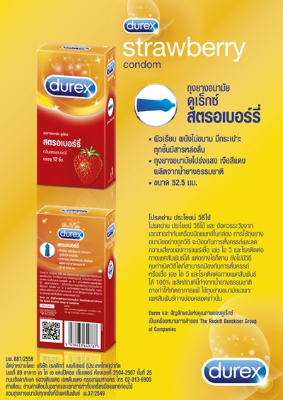 | ชื่อผลิตภัณฑ์: | ถุงยางอนามัย Durex Strawberry Condom (ดูเร็กซ์ สตรอเบอรี่) บรรจุ 12 ชิ้น |